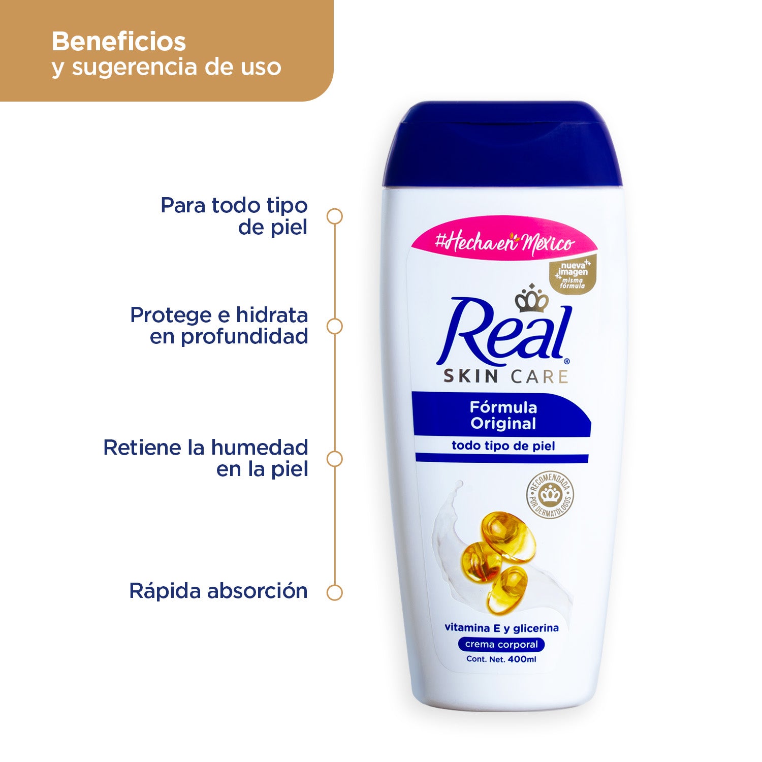 La insignia de la marca. Nuestra Crema Líquida Real Fórmula Original es una crema corporal elaborada con ingredientes 100% naturales, incluyendo vitamina E para nutrir tu piel y glicerina para proteger todo tipo de piel. Así, tú y tu familia tendrán una piel realmente saludable, suave y fresca.