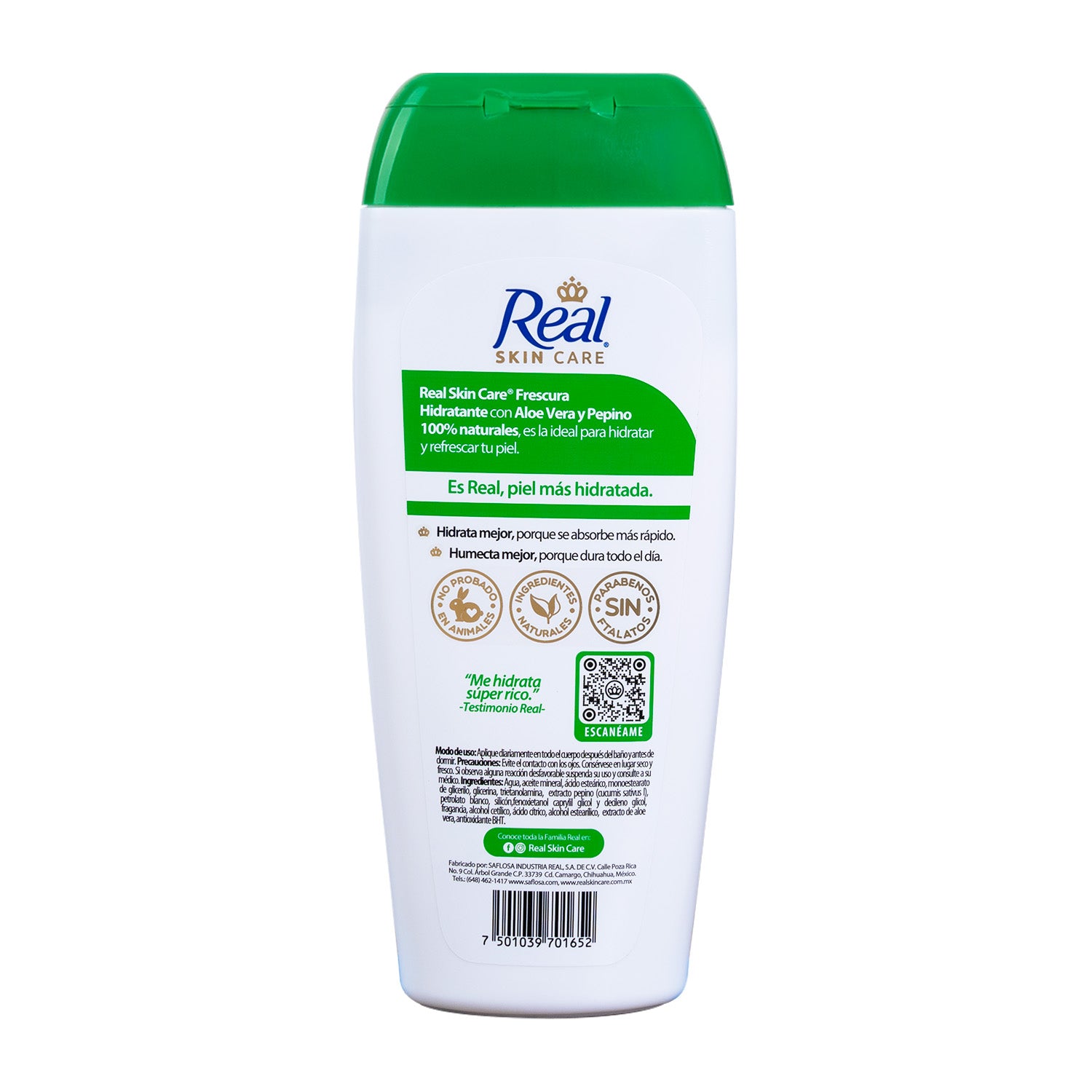 La combinación de pepino y aloe vera convierten a nuestra Crema Líquida Real Frescura Hidratante en una gran opción para hidratar tu piel y al mismo tiempo sentirla fresca. Además, su fórmula 100% natural te ayudará a proteger y reparar tu piel.
